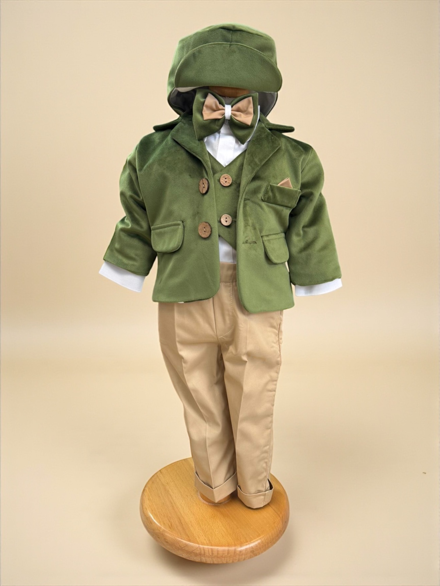 Eleganță Clasică: Costumul de Botez Verde Olive și Bej