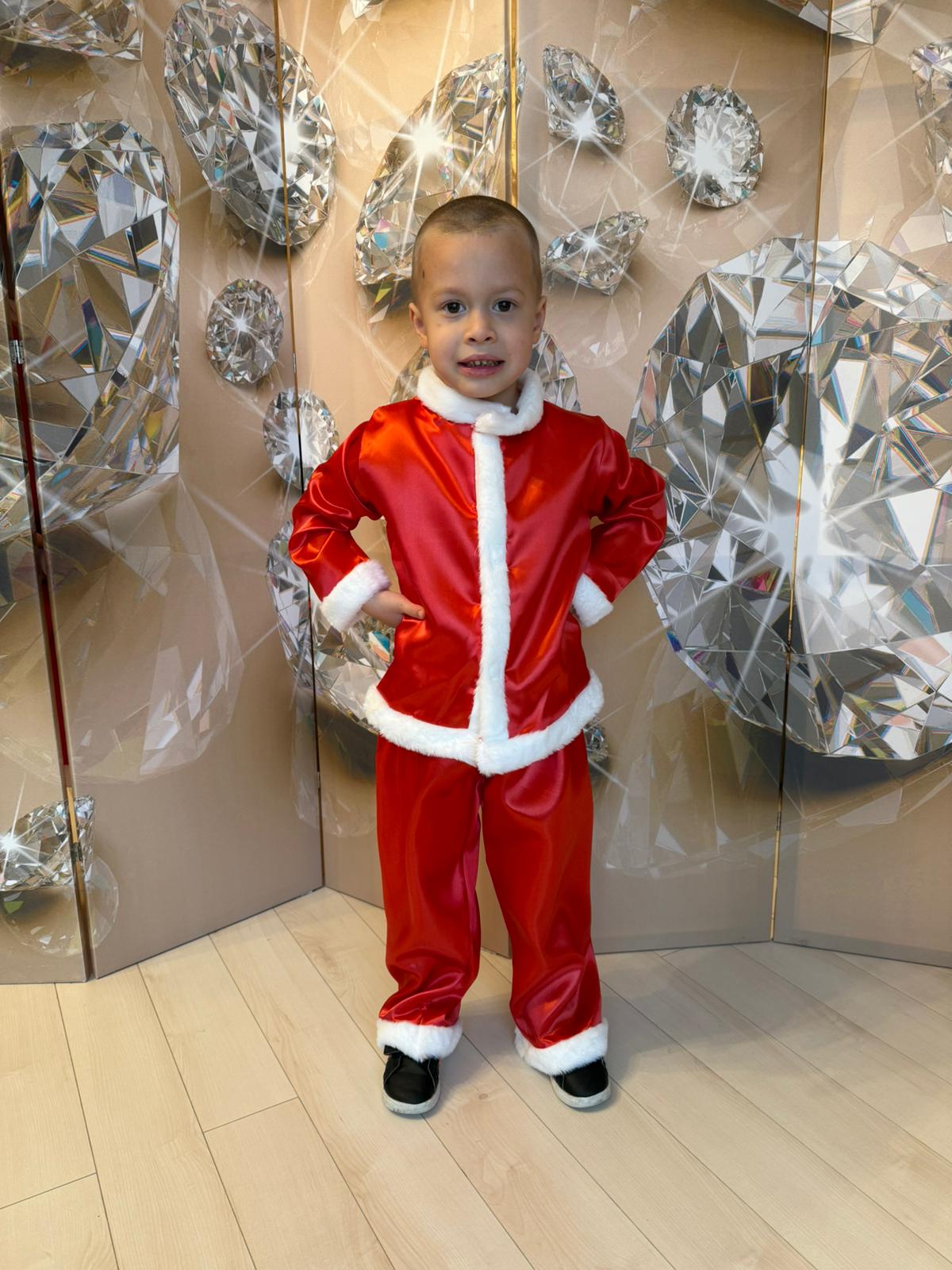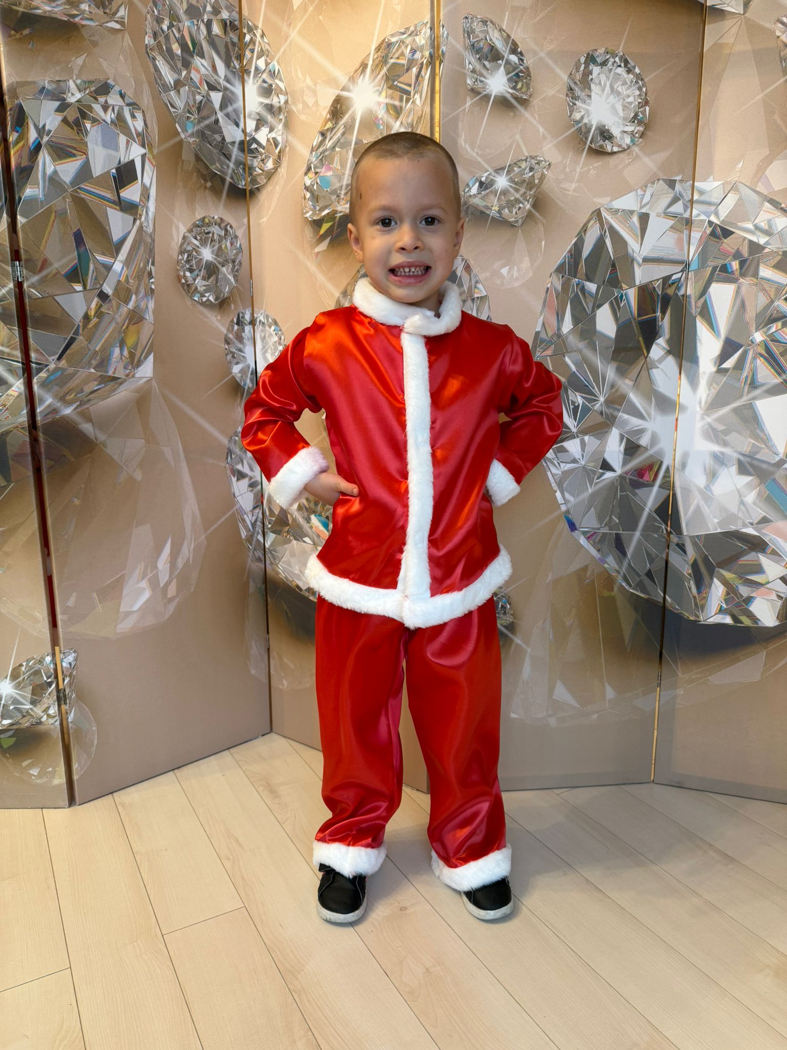 Confecționat dintr-un material satinat de înaltă calitate, costumul impresionează prin luciul său festiv și confortul pe care îl oferă. Croiala modernă, cu accente albe de pluș la guler, manșete și tiv, îl transformă într-un costum de Moș Crăciun elegant pentru copii.