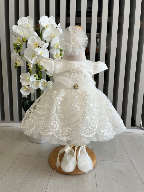 Rochie eleganta botez fetita cu broderie aplicata pe toata rochia,talie evidentiata cu strasuri, captuseala din bumbac moale , fusta din multiple straturi de tulle cu broderie aplicata.