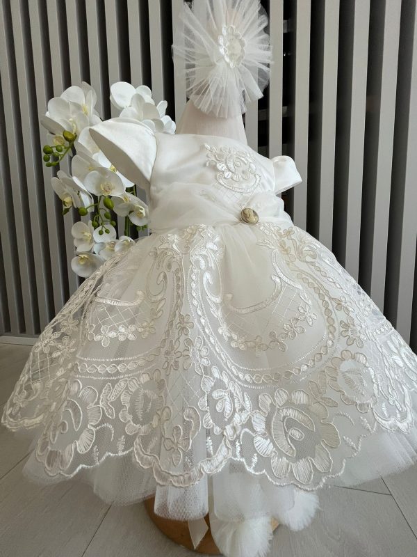 Noua noastra rochie de botez pentru fete este perfecta pentru acest moment special, iar combinatia de tulle si dantela precum si bentița delicată va face ca fetita sa arate absolut minunat.