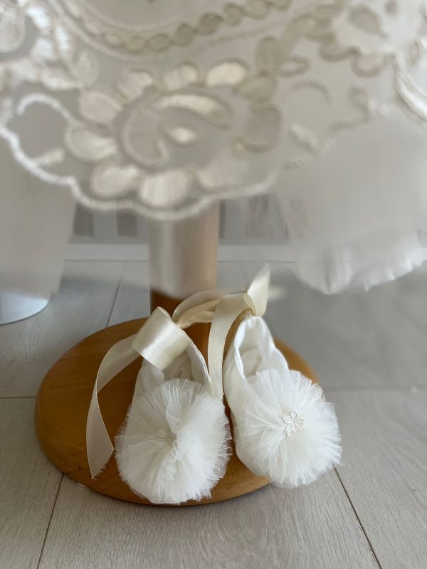 Rochita este confectionata din tulle fin și este prevăzută cu o bentiță delicata si papucei care se potrivesc perfect cu design-ul rochiei. Aceasta bentiță poate fi ajustată pentru a se potrivi perfect cu capul copilului si adaugă o notă de eleganta si delicatete.