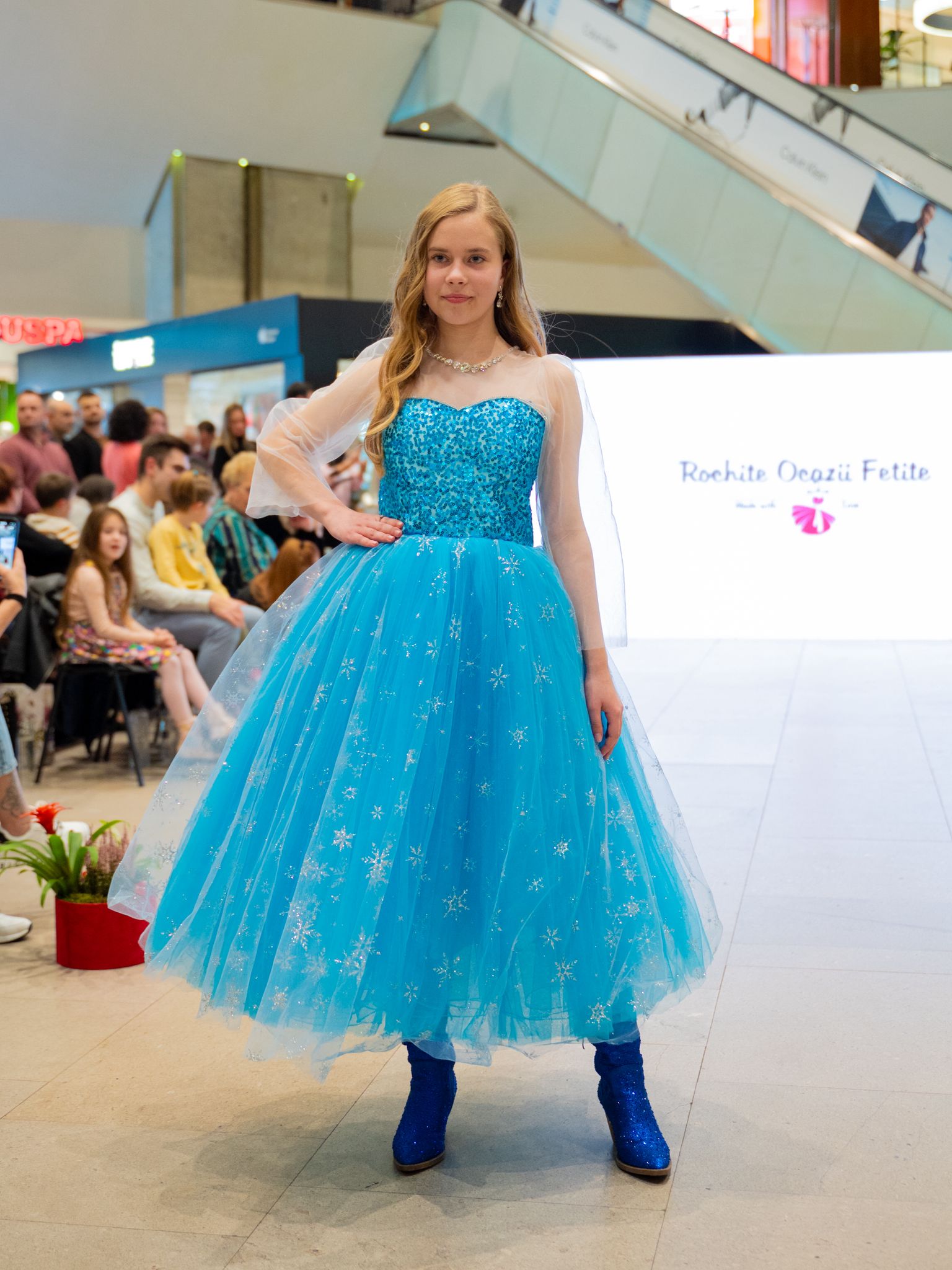 Bustul rochiei este din tafta cu paiete,maneca scurta din voal iar la gat are cateva strasuri aplicate pentru un aer aristocratic, partea de jos are straturi multiple de tulle fin cu aplicatii cu fulgi de nea pentru un look de poveste.