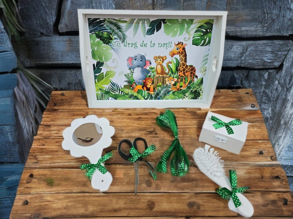 Tăviță din lemn: Personalizată cu mesajul „Cu drag de la nași!” și ilustrații Safari.