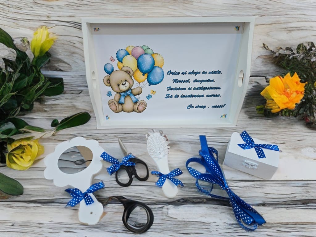 Tăviță din lemn: Personalizată cu un ursuleț adorabil și mesajul: „Orice ai alege în viață, Norocul, dragostea, Fericirea și înțelepciunea Să te însoțească mereu. Cu drag, nașii!”.